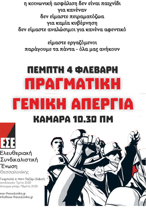 Η ημέρα της απεργίας αποτελεί για εμάς μια ευκαιρία να βρεθούμε στον δρόμο μαζί με τους συναδέλφους μας, να μοιραστούμε βιώματα και εμπειρίες και να οργανώσουμε καλύτερα την αντίστασή μας ενάντια στη λεηλασία των ζωών μας. Επιθυμούμε να ξαναδώσουμε στην απεργία το πραγματικό νόημά της, δηλαδή το μπλοκάρισμα της παραγωγικής διαδικασίας. Στεκόμαστε απέναντι στον γραφειοκρατικό συνδικαλισμό (ΓΣΕΕ, ΑΔΕΔΥ, ΠΑΜΕ), θεωρώντας ότι οι εργατικοί αγώνες και οι διεκδικήσεις των εργαζομένων είναι έργο των ίδιων και όχι των δήθεν εκπροσώπων τους, οι οποίοι τις περισσότερες φορές απλά συμβάλουν στην αφομοίωση και εκτόνωση αυτών των αγώνων.