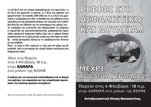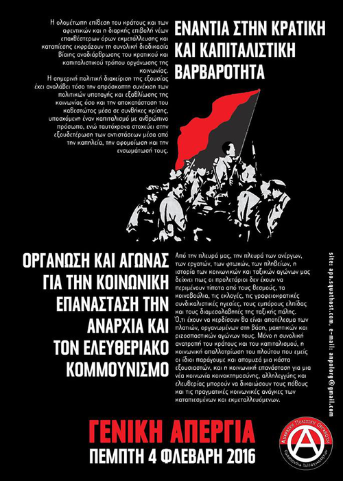 Η αναρχική ομοσπονδία καλεί τις εκμεταλλευόμενες και τους εκμεταλλευόμενους να πλαισιώσουν δυναμικά τις κινητοποιήσεις στις 4 Φλεβάρη ενάντια στο ασφαλιστικό νομοσχέδιο.
