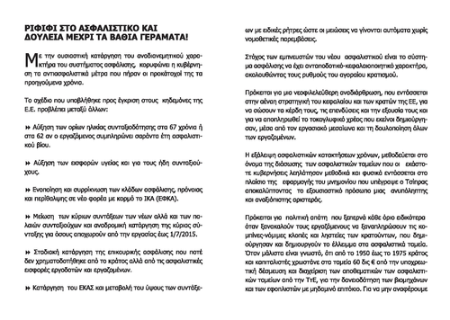 Αρχικά, προτείνεται η ενοποίηση όλων των ταμείων σε έναν ενιαίο φορέα που θα «διασφαλίζει» την κύρια ασφάλιση και σε έναν ακόμα που θα «διασφαλίζει» την επικουρική. Η δημόσια κοινωνική ασφάλιση θα είναι πια παρελθόν, καθώς θα μετατραπεί σε ατομική υποχρέωση των εργαζομένων και η δημόσια παροχή υπηρεσιών υγείας θα είναι πλέον μια ιδιωτική και κατ' επέκταση ακριβή «πολυτέλεια». Στην κορυφή όλων αυτών έρχεται να προστεθεί το κόψιμο των κύριων αλλά και των επικουρικών συντάξεων σε τρομακτικά ποσοστά! Το νέο εφάπαξ θα παρέχεται (όταν αυτό είναι δυνατό!) εμφανώς μειωμένο και η κυβέρνηση προωθεί την μείωση του ΕΚΑΣ με στόχο τη σταδιακή του εξαφάνιση ως το 2019. Ταυτόχρονα αυξάνονται οι εισφορές των εργαζομένων για ασφάλιση και υγεία με αποτέλεσμα την περαιτέρω μείωση των μισθών τους.