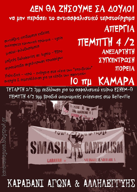 Δεν θα ζήσουμε σα δούλοι, να μην περάσει το αντιασφαλιστικό τερατούργημα, όλοι/ες την Πέμπτη 4-2-16 10πμ ΚΑΜΑΡΑ