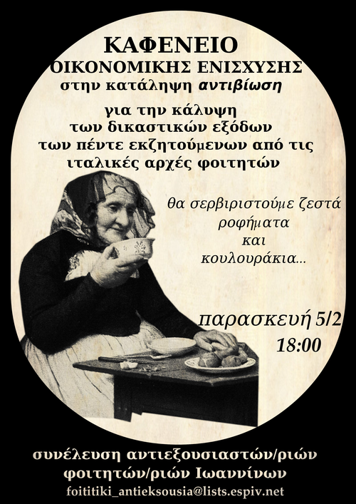 καφενείο οικονομικής ενίσχυσης στην κατάληψη αντιβίωση (παπανδρέου&μπελογιάννη γωνία) για την κάλυψη δικαστικών εξόδων των5 εκζητούμενων απο τις ιταλικές αρχές φοιτητών.