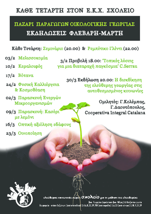 Ο ΕΚΧ Σχολείο στα πλαίσια του παζαριού παραγωγών οικολογικής γεωργίας που γίνεται κάθε Τετάρτη στο χώρο του Σχολείου σας καλωσορίζει στην έναρξη του δίμηνου κύκλου σεμιναρίων, εκδηλώσεων και προβολών που σκοπό έχουν την ελεύθερη διάδοση της γνώσης σχετικά με την οικολογική γεωργία και την παραγωγή άλλων αγαθών.