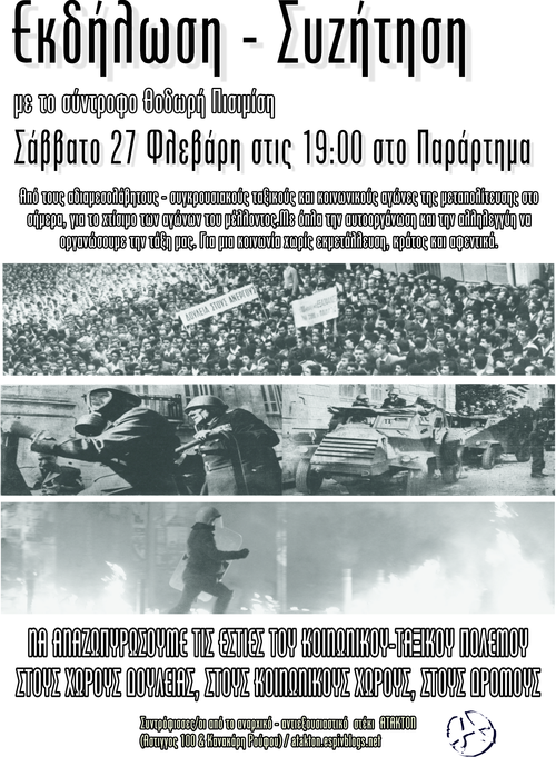 Λόγω προβλήματος υγείας του συντρόφου η εκδήλωση στο Παράρτημα στις 27/2 αναβαλλεται. Θα υπάρξει νεώτερη ενημέρωση για την ημέρα και ώρα που θα διεξαχθεί.