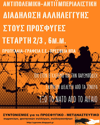 Καλούμε στην αντιπολεμική - αντιιμπεριαλιστική διαδήλωση αλληλεγγύη στους οικονομικούς και πολιτικούς πρόσφυγες, την Τέταρτη 2 Μάρτιου στις 6μ.μ. στα Προπύλαια Πανεπιστημίου.