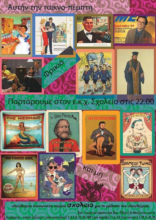 "Σχολείο για τη Μάθηση της Ελευθερίας" Ελεύθερος Κοινωνικός Χώρος (πρώην 12ο Δημοτικό Σχολείο Θεσσαλονίκης) Βασ. Γεωργίου με Μπιζανίου λεωφορεία 3,5,6,7,8,10,11,31,33,39,58 στάση ΕΥΖΩΝΩΝ (περιοχή Φάληρο)