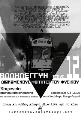 Στις 10 Μάρτη δικάζονται οι 12 φοιτητές του Φυσικού Κρήτης με αφορμή "αυτεπάγγελτη" μήνυση για τα γεγονότα που έλαβαν χώρα στα πλαίσια των κινητοποιήσεων του Οκτώβρη του 2011. Είναι σαφές ότι οι συγκεκριμένες διώξεις είναι πολιτικές, ποινικοποιώντας και καταστέλλοντας κάθε μορφή κοινωνικού αγώνα, στοχοποιόντας όποιον αγωνίζεται για τα διεκδικεί τα δικαιώματά του.