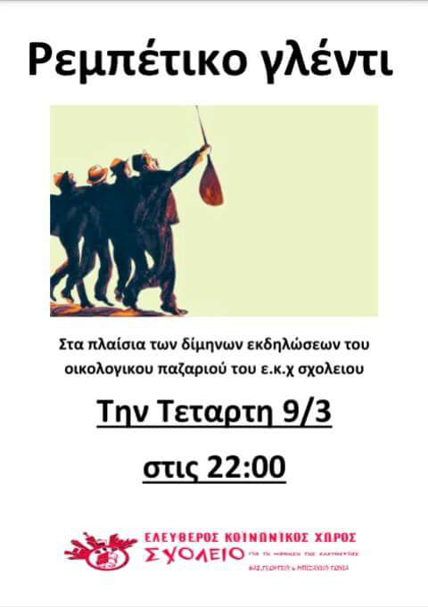 Την Τετάρτη 9/3 στις 22:00 θα πραγματοποιηθεί στο χώρο ρεμπέτικο γλέντι με τους «Γιαγκίνι» στο πλαίσιο των εκδηλώσεων που οργανώνει το οικολογικό παζάρι του εκχ Σχολείο.