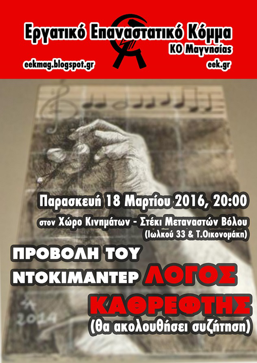 Την Παρασκευή 18 Μαρτίου 2016, στις 8μμ, στο Χώρο κινημάτων-Στέκι Μεταναστών Βόλου (Ιωλκού 33 - Τ.Οικονομάκη) θα γίνει προβολή του ντοκιμαντέρ «Λόγος Καθρέφτης» του Διαμαντή Παπαδόπουλου που αφορά τον σκληρό και πολύμηνο αγώνα των απολυμένων καθαριστριών του Υπ. Οικονομικών.