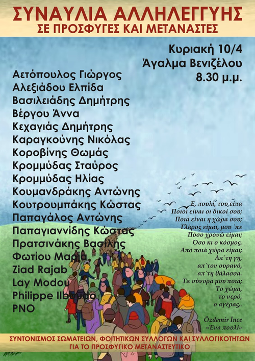 Ο Συντονισμός σωματείων, φοιτητικών συλλόγων και συλλογικοτήτων για το προσφυγικό/μεταναστευτικό απευθύνεται σε όλα τα σωματεία και τις συλλογικότητες, μπροστά στο συνεχιζόμενο δράμα των προσφύγων και τα καλεί να συντονιστούν και να δώσουν το δικό τους αντιπολεμικό, αντιιμπεριαλιστικό στίγμα ταξικής αλληλεγγύης προς πρόσφυγες και μετανάστες, να εντείνουν την έμπρακτη υλική βοήθεια, να αγωνιστούν για το σταμάτημα του πολέμου, αναδεικνύοντας τους υπεύθυνους ΝΑΤΟ, ΗΠΑ και ΕΕ και τις κυβερνητικές ευθύνες.