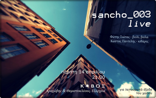 Οι SANCHO 003 είναι ο Κώστας Παντέλης (ηλεκτρική κιθάρα) και ο Φώτης Σιώτας (βιολί, βιόλα). Παίζουν μαζί από το 2008 και έχουν ηχογραφήσει δύο δίσκους: We buy gold (QUETEMPO - 2009) και Μuzga (INNER EAR - 2012).