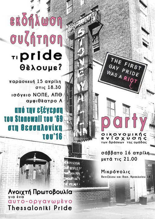 Η «Ανοιχτή Πρωτοβουλία για το 5ο Thessaloniki Pride» διοργανώνει εκδήλωση-συζήτηση με θέμα «Τι Pride θέλουμε; Από το Stonewall του '69 στην Θεσσαλονίκη του '16», την Παρασκευή 15/4. Ακολουθεί το κάλεσμα της Πρωτοβουλίας: