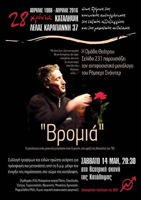 Η Ομάδα Θεάτρου Σελίδα 231 παρουσιάζει τον αντιφασιστικό μονόλογο "Βρομιά" του Ρόμπερτ Σνάιντερ.