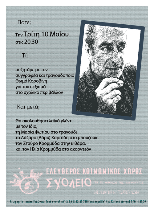 Στις 20.30 θα ξεκινήσει συζήτηση με τον συγγραφέα και τραγουδοποιό Θωμά Κοροβίνη για το φαινόμενο του σεξισμού στο σχολικό περιβάλλον.