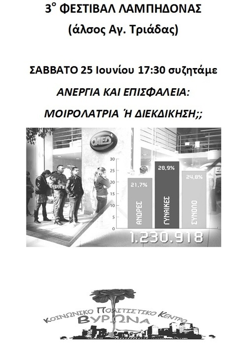 Το Σάββατο 25 Ιουνίου στις 5:30 μ.μ., στο πλαίσιο του 3ου Φεστιβάλ Λαμπηδόνας, διοργανώνουμε μια σημαντική συζήτηση για την ανεργία και την επισφάλεια, με συμμετοχή συλλογικοτήτων ανέργων και επισφαλώς εργαζομένων (Attack στην ανεργία και την επισφάλεια, Ενεργοί Άνεργοι κλπ). Ανεργία και επισφάλεια: Μοιρολατρία ή διεκδίκηση;