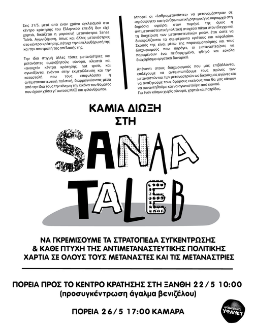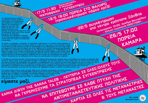 Ένας τέτοιος αγώνας είναι και αυτός της Sanaa Taleb και των υπόλοιπων µεταναστριών στο κέντρο κράτησης στο ελληνικό. Η Sanaa, παρότι απελευθερώθηκε πρόσφατα µετά από ένα χρόνο εγκλεισµού, στις 31/5 δικάζεται γιατί αντιστάθηκε -και απέτρεψε- την απόπειρα απέλασής της. Στον αγώνα της ίδιας αλλά και όλων των υπόλοιπων µεταναστριών στο κέντρο κράτησης στο ελληνικό, καθώς και σε όλους τους αγώνες που δίνουν οι µετανάστες καθηµερινά, δεν µπορούµε παρά να είµαστε µαζί.