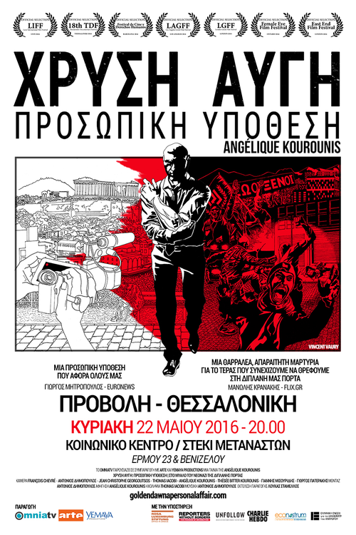 Προβολή του Ντοκυμαντέρ της Angélique Kourounis "Χρυσή Αυγή Προσωπική Υπόθεση" στα πλαίσια του διημέρου για τα γενέθλια του Κοινωνικού Κέντρου / Στεκιού Μεταναστ(ρι)ών. Θα ακολουθήσει συζήτηση με τη συμμετοχή του Λουκά Σταμέλλου από την ομάδα παραγωγής της ταινίας.