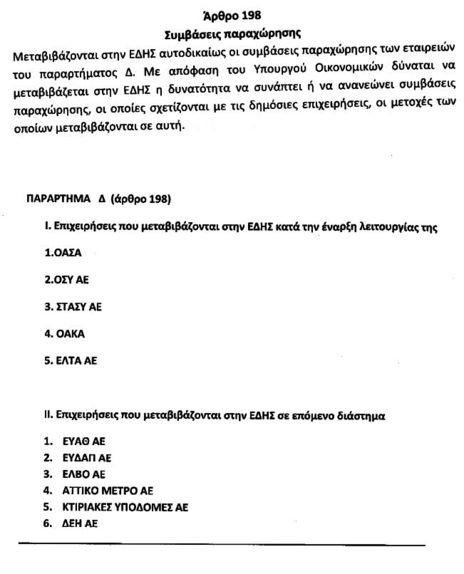 -Ξεπουλάει ολόκληρη τη δημόσια περιουσία. Συστήνει Ανώνυμη Εταιρία, στην οποία άμεσα θα μεταβιβαστούν ο ΟΑΣΑ, ο ΟΣΥ, ο ΟΣΕ, η ΣΤΑΣΥ, το ΟΑΚΑ και τα ΕΛΤΑ, ενώ στο επόμενο διάστημα πρόκειται να μεταβιβαστούν η ΕΥΑΘ, η ΕΥΔΑΠ, η ΕΛΒΟ, το ΑΤΤΙΚΟ ΜΕΤΡΟ, οι ΚΤΙΡΙΑΚΕΣ ΥΠΟΔΟΜΕΣ και η ΔΕΗ. Στην εταιρία αυτή περνάει όλη η δημόσια περιουσία, " η κυριότητα και νομή όλων των κινητών και ακίνητων περιουσιακών στοιχείων τα οποία ανήκουν στο Ελληνικό Δημόσιο" εκτός από παραλίες, περιοχές Natura, αρχαιολογικούς χώρους και αμιγώς δασικές εκτάσεις. Φυσικά την εποπτεία της διοίκησης θα έχει επιθεωρητής των δανειστών, ο οποίος και θα "ορίζεται από κοινού από την Ευρωπαϊκή Επιτροπή και τον Ευρωπαϊκό Μηχανισμό Σταθερότητας".