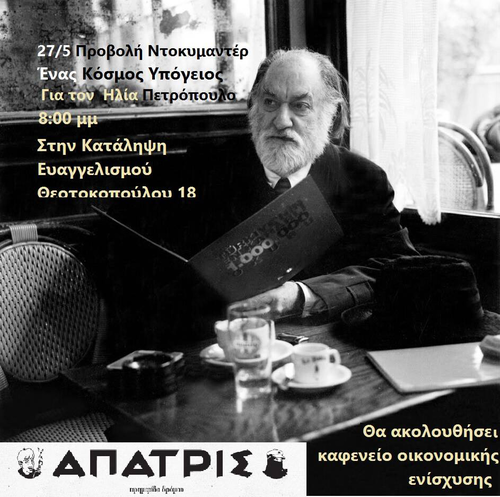 Προβολή ντοκιμαντέρ για τον Ηλία Πετρόπουλο '' Ένας κόσμος υπόγειος'' στις 20.00, κατάληψη Ευαγγελισμού