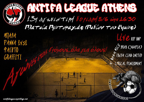 Τη Κυριακή 5 Ιουνίου, από τις 16.30 σας περιμένουμε για την 13η αγωνιστική της Αντιφασιστικής Λίγκας στη γειτονιά της Κυψέλης στη Πλατεία πρωτομαγιάς, (Πεδίον του Αρεως - Ευελπίδων & Μουστοξύδη)