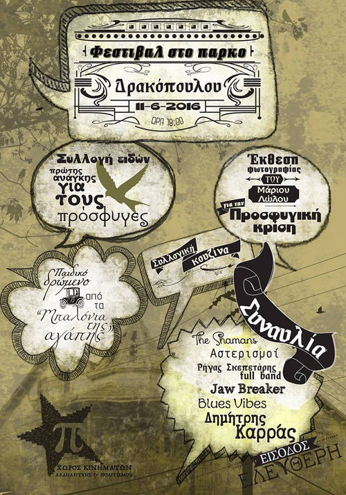Σας περιμένουμε από τις 18.00 το απόγευμα με παιδικό δρώμενο και συνεχίζουμε μέχρι το βράδυ με συλλογική κουζίνα και συναυλία με τοπικά συγκροτήματα. Στο χώρο θα υπάρχει έκθεση φωτογραφίας του Μάριου Λώλου με θέμα την προσφυγική κρίση και καθ' όλη τη διάρκεια του φεστιβάλ θα συλλέγουμε είδη πρώτης ανάγκης για τους πρόσφυγες.