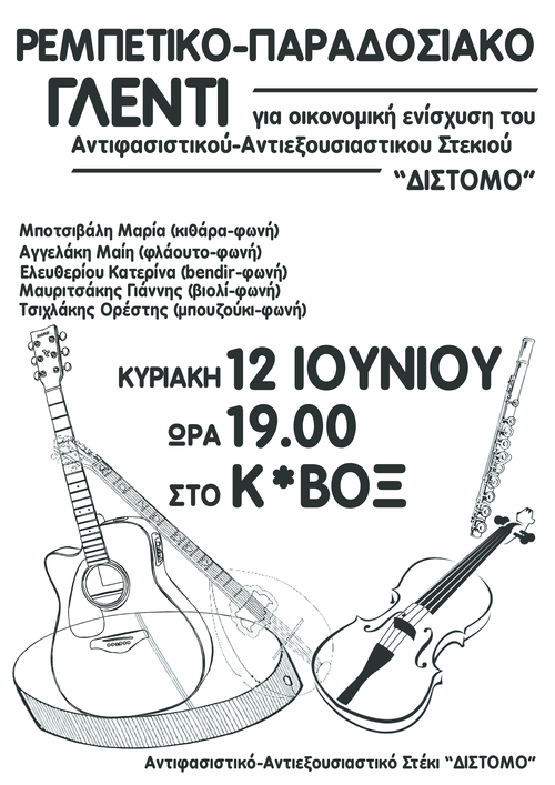 Ρεμπέτικο-παραδοσιακό γλέντι για την οικονομική ενίσχυση του αντιφασιστικού/αντιεξουσιαστικού στεκιού «Δίστομο»