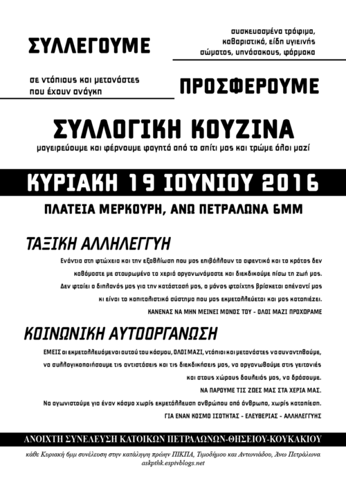 Κυριακή 19 Ιουνίου 2016, πλ. Μερκούρη 6μμ, Συλλογική Κουζίνα και Συλλογή-Προσφορά ειδών