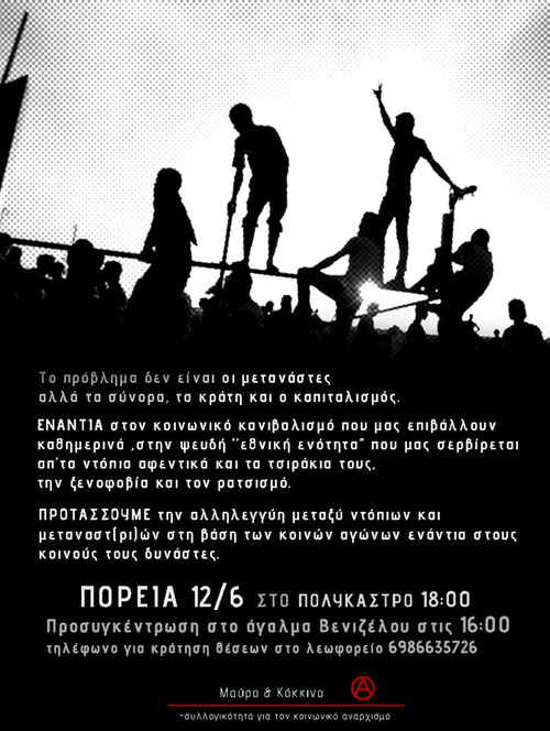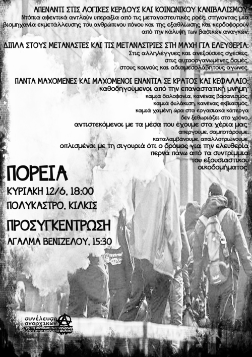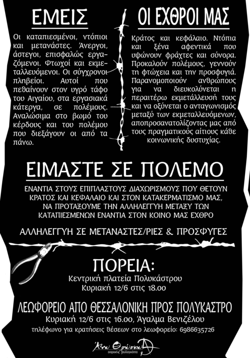 Απέναντι σε κάθε εξουσία, εμείς απαντάμε τώρα και πάντα με ταξική αλληλεγγύη. Οι ταλαιπωρημένοι, οι ξυπόλητοι της εποχής μας, οι κυνηγημένοι εξαιτίας των πολέμων και των διώξεων κάθε εξουσίας και κάθε κράτους, βρίσκονται στην καρδιά της αλληλεγγύης μας. Είναι ταξικά αδέρφια μας, το πιο υποτιμημένο, κακοπληρωμένο και επισφαλές μέρος της τάξης μας, βορά στα δόντια κάθε μικρού και μεγάλου αφεντικού. Είναι καθήκον μας να διαφυλάξουμε την αξιοπρέπεια και την ελεύθερη μετακίνηση όλων των μεταναστών και μεταναστριών, σβήνοντας τις συνοριακές γραμμές που οι εξουσίες χάραξαν για τους υπηκόους τους -αλλά όχι για τα εμπορεύματα των αφεντικών- και απαιτώντας την άμεση νομιμοποίησή τους.