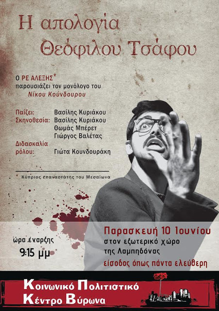 Παρασκευή 10 Ιουνίου: 9:15 μμ.: Η ΑΠΟΛΟΓΙΑ ΤΟΥ ΘΕΟΦΙΛΟΥ ΤΣΑΦΟΥ (θεατρικός μονόλογος του Νίκου Κούνδουρου)