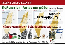 Με αφορμή την 29η Νοέμβρη, Διεθνή Ημέρα Αλληλεγγύης προς τον Παλαιστινιακό Λαό, ο Σύλλογος Αλληλεγγύης στον Παλαιστινιακό Λαό ΙΝΤΙΦΑΝΤΑ διοργανώνει το Σάββατο 28 Νοέμβρη, στις 7μμ, στο Χώρο Κινημάτων - Στέκι Μεταναστών (Ιωλκού 33, Βόλος) βιβλιοπαρουσίαση του βιβλίου του Νασίμ Αλατράς «Παλαιστίνη: Αιτίες και μύθοι». Πρόκειται για ένα αποκαλυπτικό βιβλίο που παρουσιάζει την ιστορία της Παλαιστίνης από το 1917 μέχρι σήμερα, φέρνει στην επιφάνεια τα βαθύτερα αίτια των συγκρούσεων στη Μέση Ανατολή, συνιστά μια γροθιά στους μύθους και την ιστορία των ισχυρών.