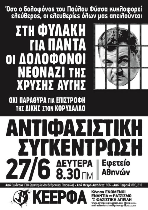Αντιφασιστική συγκέντρωση 27 Ιούνη, 8.30πμ, Εφετείο Αθηνών, Λ.Αλεξάνδρας & Λουκάρεως ενάντια στους δολοφόνους νεοναζί της Χρυσής Αυγής