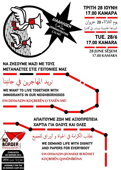 Το Σάββατο 25 Ιουνίου δίνουμε διπλή απάντηση στο κράτος και τους φασίστες, το πρωί στις 11:00 συγκεντρωνόμαστε στο Άγαλμα Βενιζέλου, -όπως κάθε Σάββατο- στα πλαίσια εξορμήσεων που έχει προγραμματίσει η συνέλευση του nobordercamp 2016, για τη μηχανοκίνητη διαδήλωση προς τα κέντρα κράτησης-εκτόπισης γύρω από τη Θεσσαλονίκη. Ερχόμαστε σε επικοινωνία με τους πρόσφυγες και τους μετανάστες, μοιράζουμε υλικό, επιδιώκοντας την παρουσία τους στο δημόσιο χώρο και στις διαδικασίες του Noborder. Προετοιμάζουμε τη διαδήλωση αλληλεγγύης σε πρόσφυγες και μετανάστες της Τρίτης 28ης Ιούνη 17.00 από την Καμάρα.