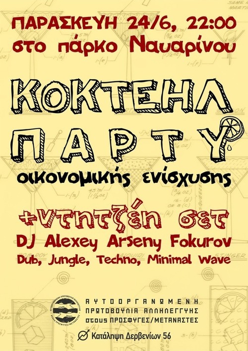 Κοκτέηλ Πάρτυ στο αυτοδιαχειριζόμενο πάρκο Ναυαρίνου, για την οικονομική ενίσχυση της Αυτοοργανωμένης Πρωτοβουλίας Αλληλεγγύης σε Πρόσφυγες/Μετανάστες-ριες. Παρασκευή 24/6, 22:00