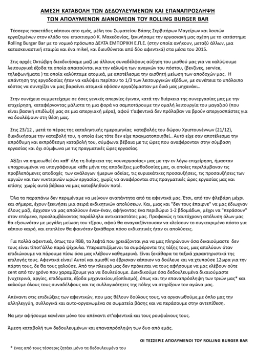 Αλληλεγγύη στους απολυμένους διανομείς του Rolling Burger Bar