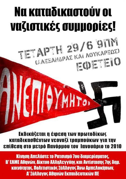 Τα σωματεία και οι φορείς της περιοχής κινητοποιούμαστε ξανά για να ενημερώσουμε την τοπική κοινωνία και για να οργανώσουμε την κινηματική παρουσία μας μέσα και έξω από το δικαστήριο την Τετάρτη 29 Ιουνίου. Καλούμε σε συγκέντρωση την ερχόμενη Τετάρτη 29 Ιουνίου 9πμ στο Εφετείο. Ζητάμε επίσης οικονομική ενίσχυση από συλλογικότητες, όπως και κάθε αντιφασίστα αγωνιστή και αγωνίστρια για την κάλυψη των δικαστικών εξόδων που ανέρχονται σε περίπου 2.000 ευρώ για την πολιτική αγωγή .