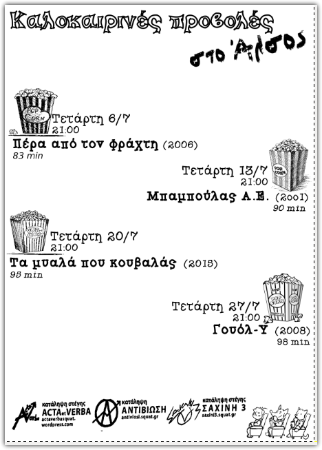 Καλοκαιρινές προβολές στο Άλσος, κάθε Τετάρτη στις 21.00 για όλο τον Ιούλιο, από τις καταλήψεις Αντιβίωση, Σαχίνη 3 και Acta et Verba.
