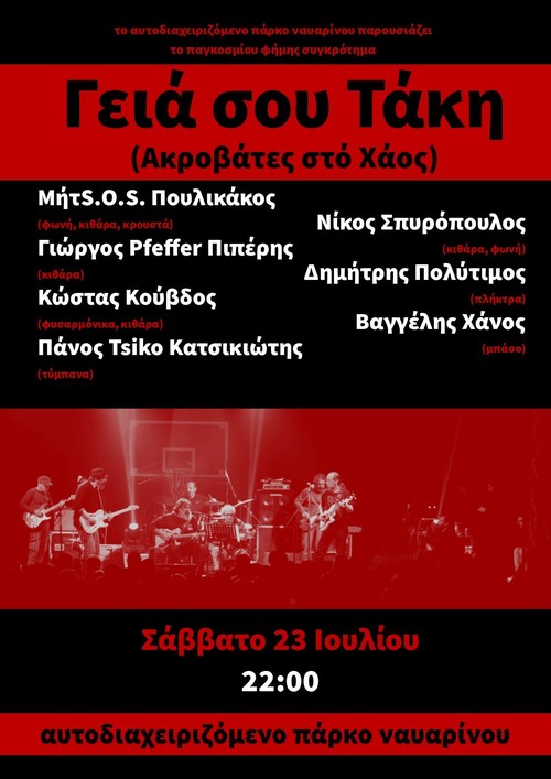 Το παγκοσμίου φήμης συγκρότημα ΓΕΙΑ ΣΟΥ ΤΑΚΗ αυτό το Σάββατο 23/7 στις 22:00 στο Αυτοδιαχειριζόμενο Πάρκο Ναυαρίνου! Τα έσοδα θα διατεθούν για την ανακαίνιση της παιδικής χαράς του πάρκου, για να γίνει πιο φιλική προς τα παιδιά.