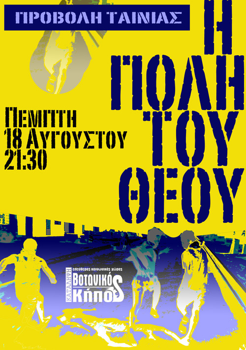 Η ομάδα "Σινέ Βοτανικός" στο πλαίσιο των τακτικών θερινών προβολών της (κάθε Πέμπτη) παρουσιάζει τη Βραζιλιάνικη ταινία σε σκηνοθεσία Φερνάντο Μεϊρέγιες και Κάτια Λουντ