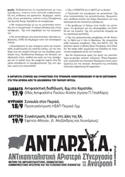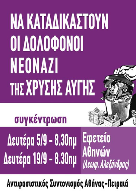 - Δευτέρα 19/9, 30πμ., Συγκέντρωση στη Δίκη της ΧΑ, Εφετείο Αθηνών, Λ. Αλεξάνδρας και Λουκάρεως