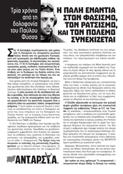 Τρία χρόνια κλείνουν στις 18 Σεπτέμβρη από τη δολοφονία του αντιφασίστα μουσικού Παύλου Φύσσα από μέλη του τάγματος εφόδου της ναζιστικής συμμορίας που φέρει κατ' ευφημισμό την επωνυμία «χρυσή αυγή». Αυτή η εν ψυχρώ δολοφονία αποτέλεσε κορύφωση της αποθράσυνσης των ανθρωπόμορφων τεράτων του φασισμού, καθώς προηγούμενες εγκληματικές ενέργειές τους κατά Ελλήνων και μεταναστών, (όπως οι επιθέσεις στους Αιγύπτιους ψαράδες, στους συνδικαλιστές του ΠΑΜΕ στο Κερατσίνι, η δολοφονία του νεαρού μετανάστη Σαχζάτ Λουκμάν στα Πετράλωνα κλπ), δεν αντιμετωπίστηκαν από την ελληνική δικαιοσύνη, που εξακολουθεί να κωλυσιεργεί, αφήνοντας ατιμώρητους τους δολοφόνους του Παύλου Φύσσα.