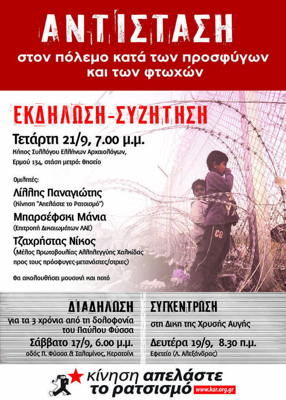 - Σάββατο 17/9, 18:00, Αντιφασιστική διαδήλωση στο Κερατσίνι, Οδός Αντιφασίστα Παύλου Φύσσα (πρώην Π.Τσαλδάρη)
