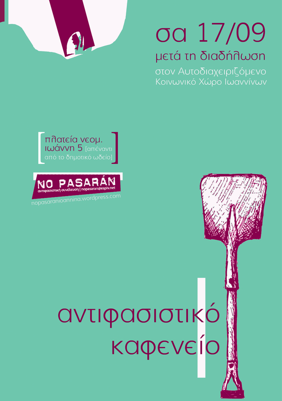 Μετά την αντιφασιστική διαδήλωση, θα ακολουθήσει καφενείο οικονομικής ενίσχυσης της αντιφασιστικής συνέλευσης No Pasarán στον Αυτοδιαχειριζόμενο Κοινωνικό Χώρο Ιωαννίνων.