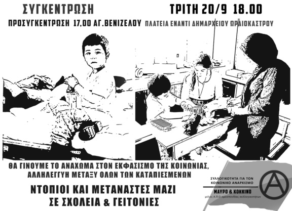 Την Τρίτη 20/9 θα πραγματοποιηθεί παρέμβαση στο Ωραιόκαστρο με αφορμή τη ρατσιστική απόφαση συλλόγων γονέων του Ωραιοκάστρου να μην δεχτούν παιδιά προσφύγων σε κάποια σχολεία στο Ωραιόκαστρο. Τα καλέσματα είναι: Τρίτη 20/9 στις 17:00 στο Αγ. Βενιζέλου και στις 18:00 προσυγκέντρωση στο παρκάκι Δημαρχείου Ωραιοκάστρου. Όσοι από τους συμμετέχοντες διαθέτουν μεταφορικό μέσο είναι καλό να να έρθουν στις 17:00 στο Αγ. Βενιζέλου για να μοιραστεί ο κόσμος.