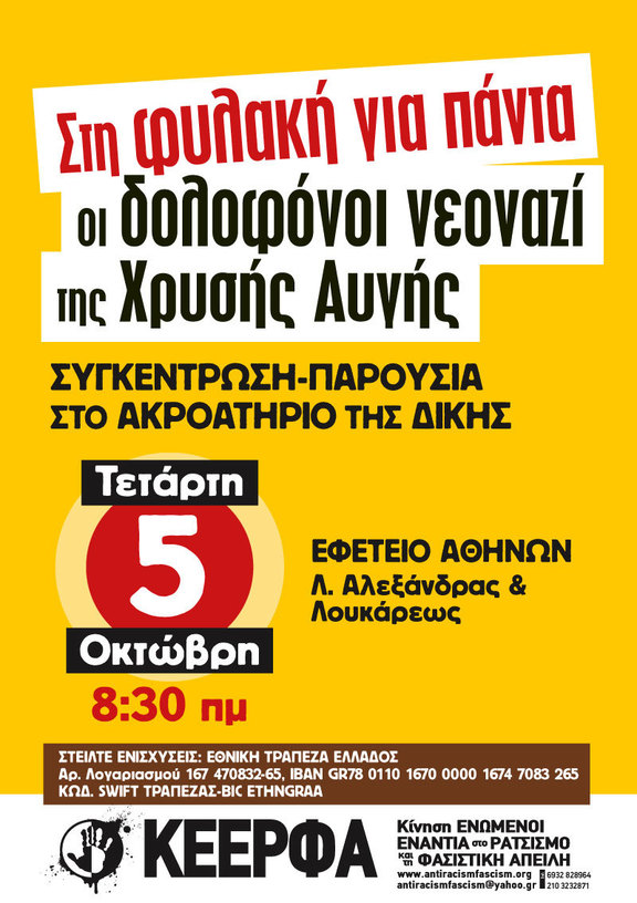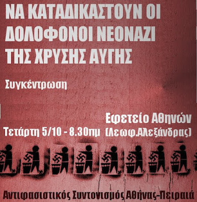 Αντιφασιστική συγκέντρωση, Τετάρτη 5 Οκτώβρη, 8.30πμ, Εφετείο Αθηνών, Λ.Αλεξάνδρας και Λουκάρεως