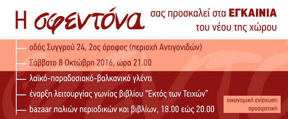 Οι εργασίες στο νέο χώρο της Σφεντόνας ολοκληρώνονται, ώστε να υποδεχθεί το κοινό στα εγκαίνια του, το ΣΑΒΒΑΤΟ 8 ΟΚΤΩΒΡΗ. Η μέρα των εγκαινίων θα περιλαμβάνει εκτός από γλέντι με ζωντανή μουσική το bazaar παλιών βιβλίων και περιοδικών αλλά και την έναρξη της λειτουργίας της γωνίας βιβλίου «Εκτός των Τειχών».