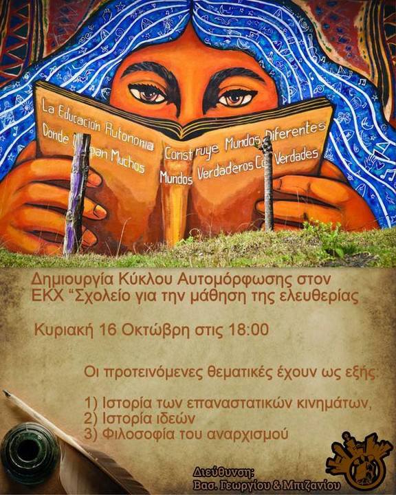 Κάλεσμα για τη δημιουργία του κύκλου αυτομόρφωσης Κυριακή 16 Οκτώβρη στις 18:00 στον ΕΚΧ «Σχολείο για την μάθηση της ελευθερίας».