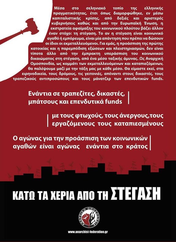 Εμείς, ως αναρχικοί/ες αντιλαμβανόμαστε την στέγαση σαν αδιαμφισβήτητη κοινωνική και βασική ανάγκη και σε όλους αυτούς που θα προσπαθήσουν να τη στερήσουν από οποιονδήποτε άνθρωπο, έχουμε να πούμε το εξής: Θα μας βρείτε απέναντί σας! Δεν θα επιτρέψουμε να περάσει στα χέρια των τραπεζών κανέναν σπίτι.