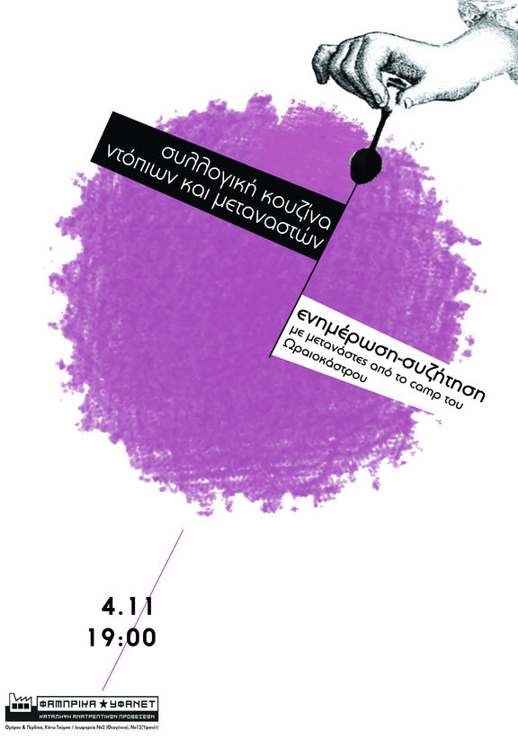 Συλλογική κουζίνα και συζήτηση-ενημέρωση με μετανάστες από το κέντρο μετεγκατάστασης στο Ωραιόκαστρο. Ενημέρωση για τις συνθήκες διαβίωσης στα camp καθώς και για τα γεγονότα που ακολούθησαν μετά τον θανάσιμο τραυματισμό μεταναστών και τις εντάσεις που δημιουργήθηκαν.