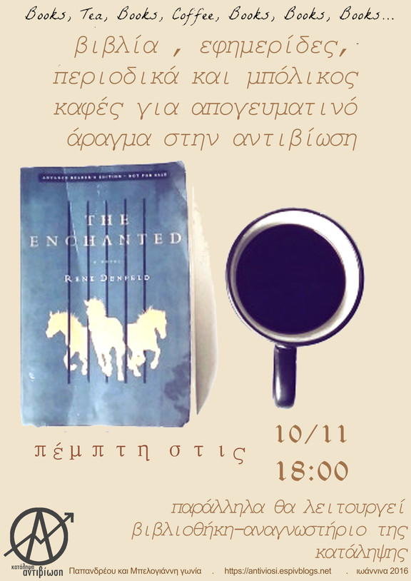 βιβλία, εφημερίδες, περιοδικά και μπόλικος καφές για απογευματινό άραγμα στην κατάληψη Αντιβίωση την Πέμπτη 10/11 από τις 18:00. Στον χώρο της κατάληψης θα λειτουργεί παράλληλα βιβλιοθήκη-αναγνωστήριο.