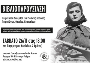 Σάββατο, 26/11, στις 6μμ στο Παράρτημα (Κορίνθου και Αράτου): Βιβλιοπαρουσίαση "Η μάχη του Δεκέμβρη του 1944 στις περιοχές Πετραλώνων, Θησείου, Κουκακίου"