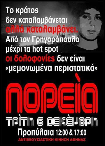 8 χρόνια μετά το ελληνικό κράτος συνεχίζει τη δολοφονική του πολιτική βάζοντας αυτή τη φορά στο στόχαστρο, τους αόρατους από τα δυτικά media αυτού του πλανήτη, τους κατατρεγμένους, τους πρόσφυγες και τους μετανάστες. Αφού εξάντλησε το ανθρωπιστικό της προσωπείο σε διακηρύξεις, η αριστερή κυβέρνηση «υποδέχτηκε» τους πρόσφυγες στη θάλασσα του Αιγαίου, όπου χάθηκαν εκατοντάδες ζωές και στη συνέχεια τους εγκλώβισε στα νησιά στα κλειστά κέντρα κράτησης "hot spot", όπου καθημερινά ο κατάλογος των θυμάτων αυξάνεται. Τα hot spot είναι η αποτύπωση του σύγχρονου ολοκληρωτισμού της Ευρώπης των κλειστών συνόρων, των φραχτών και της ξενοφοβίας, με επιστέγασμα τη συμφωνία με την Τουρκία, που επί της ουσία καταργεί το θεμελιώδες δικαίωμα στο πολιτικο άσυλο, ενεργοποιεί τις επανπροωθήσεις και τις απελάσεις και την οποία έσπευσε να υπογράψει η κυβέρνηση Σύριζα. Μία κυβέρνηση η οποία δε διστάζει να πουλάει αριστεριλίκι στην Κούβα, την ίδια στιγμή που στην Ελλάδα ρημάζεται κάθε έννοια ανθρώπινης αξιοπρέπιας.
